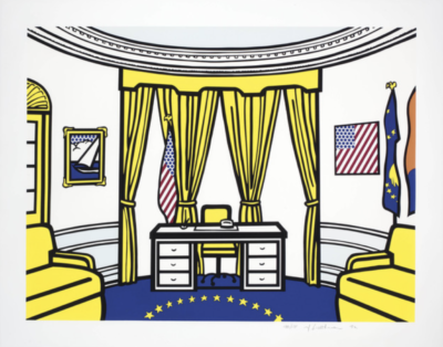 5 May 2019ROY LICHTENSTEIN – The Oval Office by GlobalGalleries | posted in: Graphics | 0 Roy Lichtenstein – The Oval Office, 1992. Screenprint in colours. Global Galleries ROY LICHTENSTEIN The Oval Office, 1992Screenprint in colors, on Rives BFK paper Hand-signed by artist 36 × 45 1/2 in (91.4 × 115.6 cm) Edition: 175 Price: on request